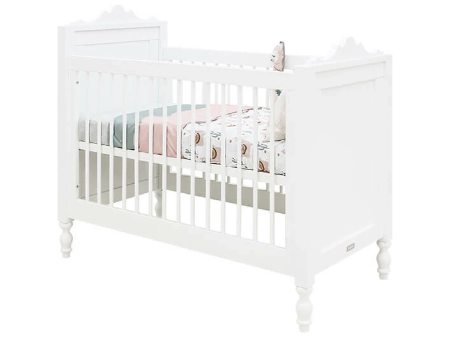 Ledikant Belle wit, 60 x 120 cm. Het bed heeft ronde spijlen en een sierlijk hoofd- en voeteneinde.