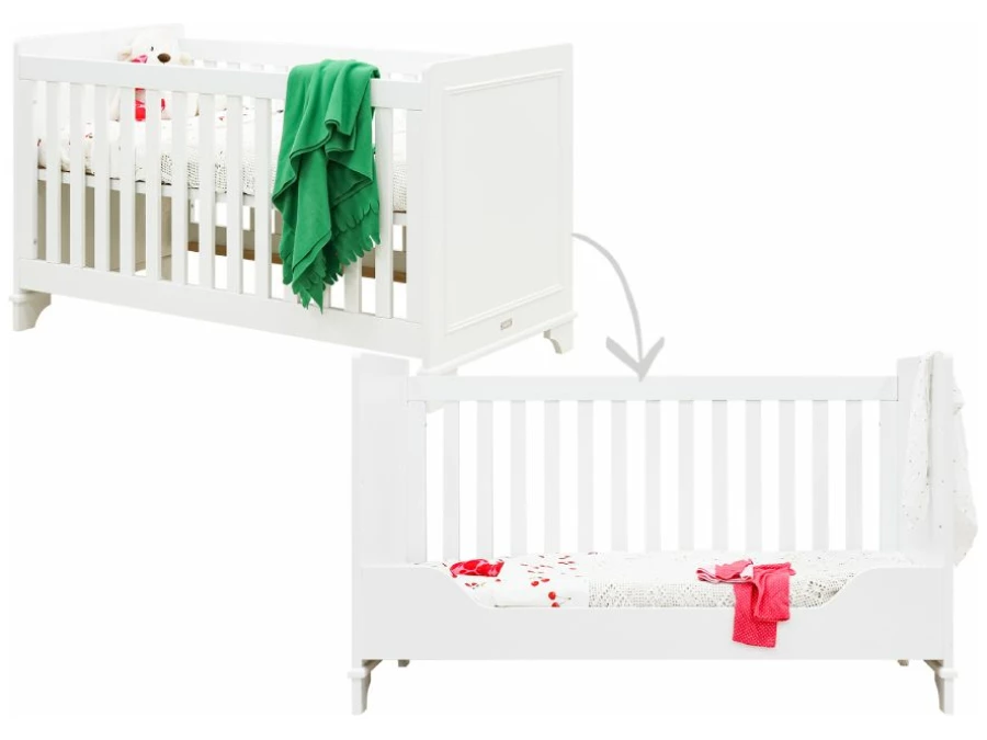 Dit babybed (70 x 140 cm) van de serie Charlotte is om te bouwen van een babybed met spijlen, naar een peuter bedbank zodat de kleine zelf kan in- en uitstappen en hieraan kan wennen. Bedbodem, spijlenrek en lage zijde voor de bedbank worden standaard meegeleverd. Bedbodem van het spijlenbed is verstelbaar in hoogte. De maat, 70 x 140 cm, is hetzelfde voor beide bedden waardoor 1 matras volstaat. Omdat je dit bed kan ombouwen heb je er lang plezier van! Let op: dit bed is niet om te bouwen naar een cotbed variant, er is altijd 1 spijlenzijde aanwezig.