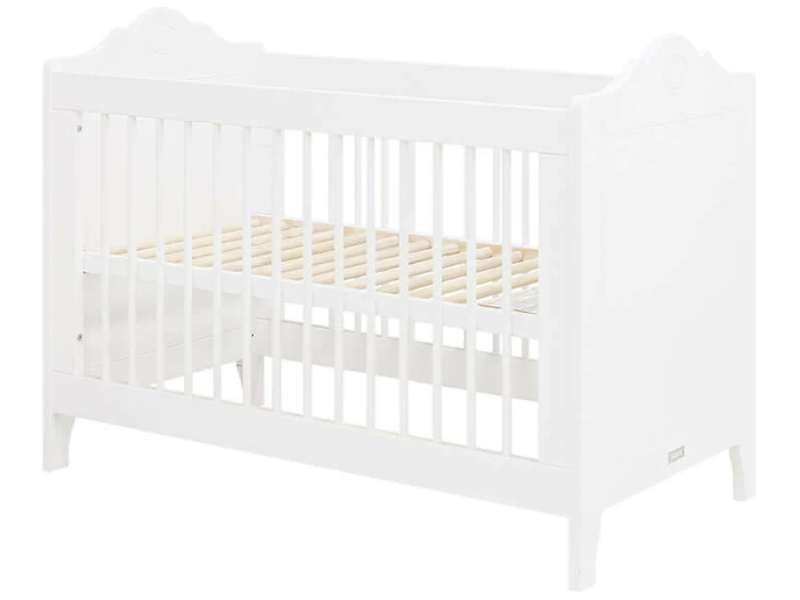 Ledikant Evi is voorzien van een sierlijke gegolvde kam op het hoofd- en voeteneind. Kenmerkend voor deze serie. De bedbodem is verstelbaar in hoogte, zodra de baby zichzelf kan optrekken kun je de bodem verlagen voor extra veiligheid. Combineer dit bed met de andere meubels van de serie Evi!