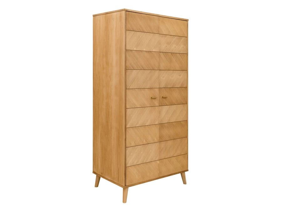 De kledingkast Manou van Bopita is uitgerust met deuren voorzien van een stoer visgraatmotief en staat elegant op slanke, schuin geplaatste pootjes. De deuren sluiten zachtjes dankzij het ingebouwde softclose-mechanisme en zijn voorzien van slanke, goudkleurige handgrepen. De gekozen afwerking laat de natuurlijke houtstructuur mooi tot zijn recht komen, met een warme uitstraling als resultaat. Het gebruikte hout is afkomstig uit Europese bossen, wat bijdraagt aan duurzaamheid.