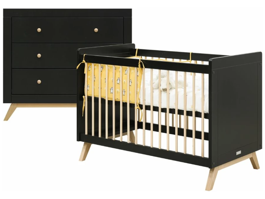 De tweedelige Nora babykamer van Bopita heeft een prachtige eigentijdse uitstraling. Het staat op beukenhouten pootjes en heeft beuken handgrepen. De set bestaat uit een commode en ledikant. Beide meubelen zijn van sterk MDF en afgewerkt met mat zwarte lak op waterbasis. De bodem van het ledikant is verstelbaar en de matrasmaat is 60×120. De commode beschikt over soft-close lades welke zorgen voor voldoende opbergruimte.