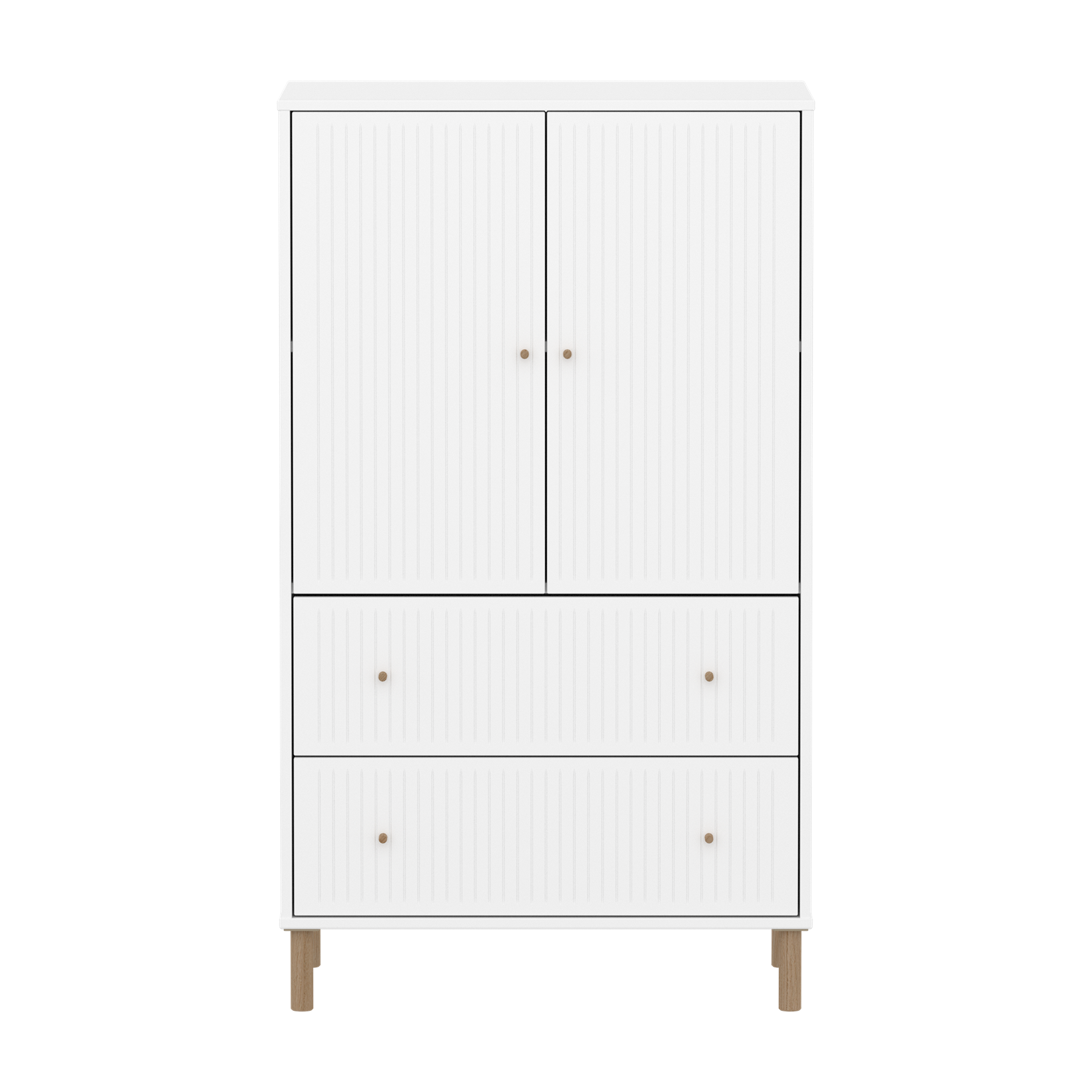 De Flexa Saga Kast heeft 2 deuren, 2 lades en 1 verstelbare plank. De soft-close deuren en lades beschermen kleine vingers en bieden veiligheid, terwijl de ronde eiken knoppen een verfijnde, eenvoudige nordische uitstraling geven.
