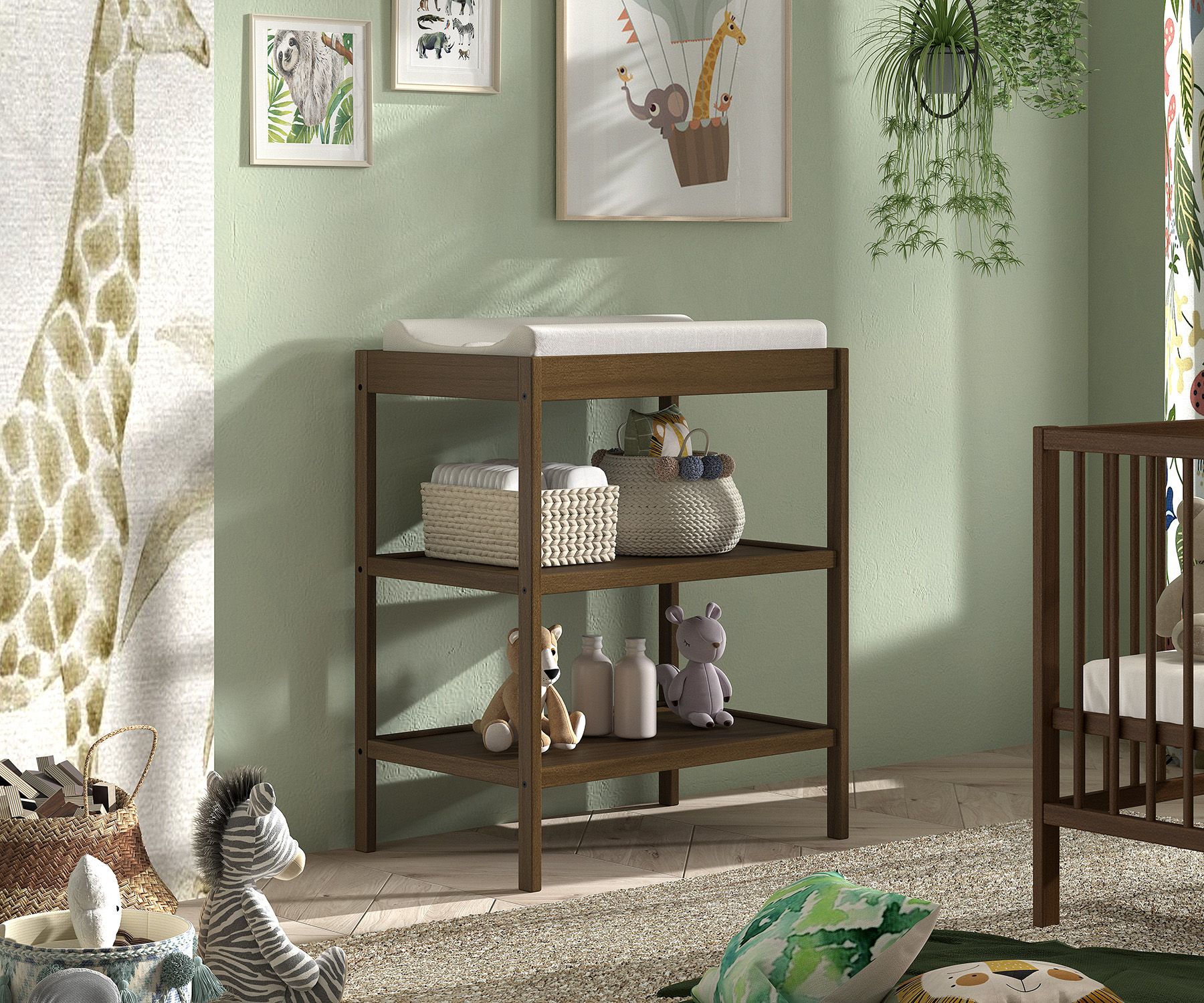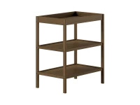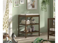 De bijbehorende verzorgingstafel biedt een royaal verschoningsoppervlak en twee open planken, perfect om luiers, verzorgingsproducten en andere benodigdheden overzichtelijk op te bergen. Het doordachte ontwerp zorgt ervoor dat alles wat je nodig hebt binnen handbereik is tijdens het verschonen.
