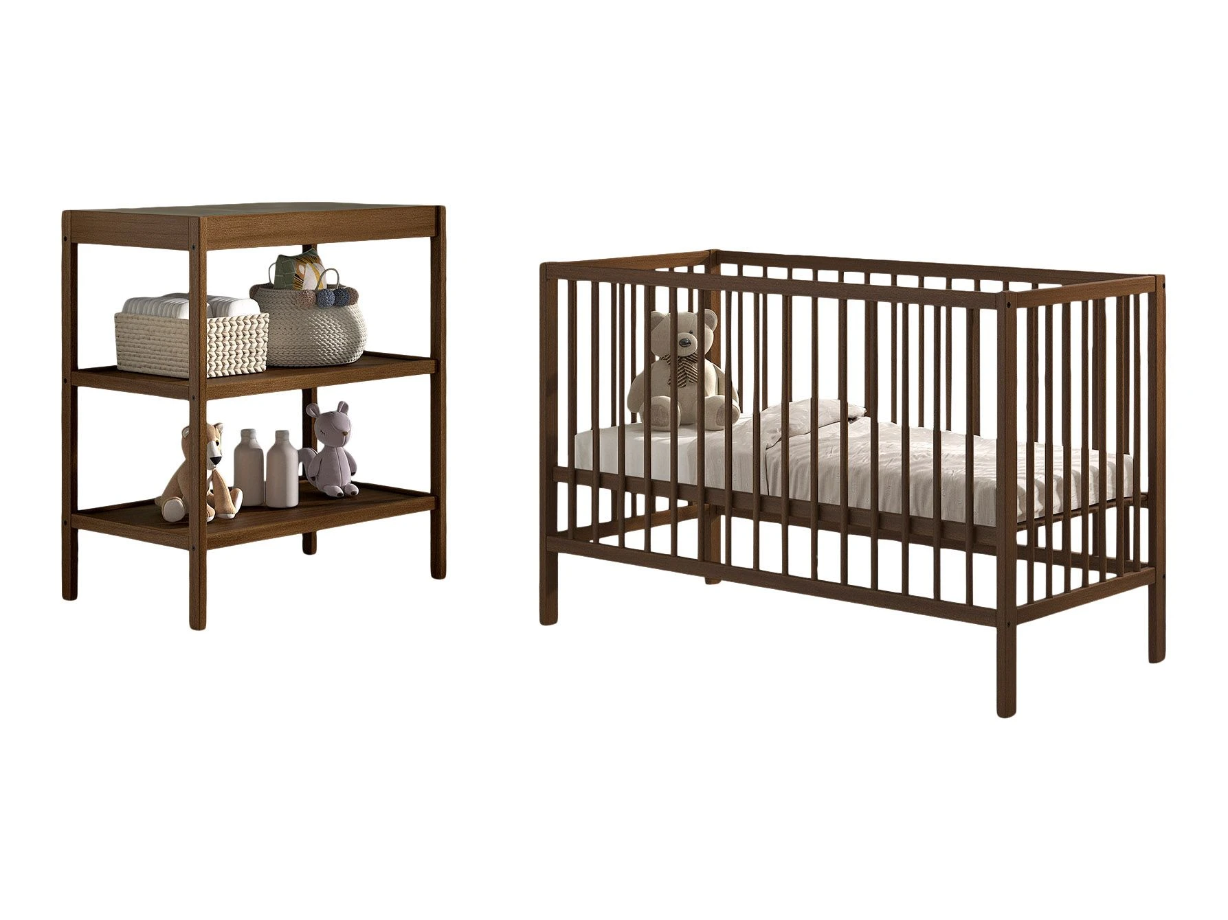 Beide meubels zijn vervaardigd uit duurzaam hout met een natuurlijke afwerking die warmte en rust uitstraalt. Dankzij het eenvoudige, moderne ontwerp passen het ledikant en de verzorgingstafel moeiteloos bij uiteenlopende interieurstijlen, van minimalistisch tot klassiek.