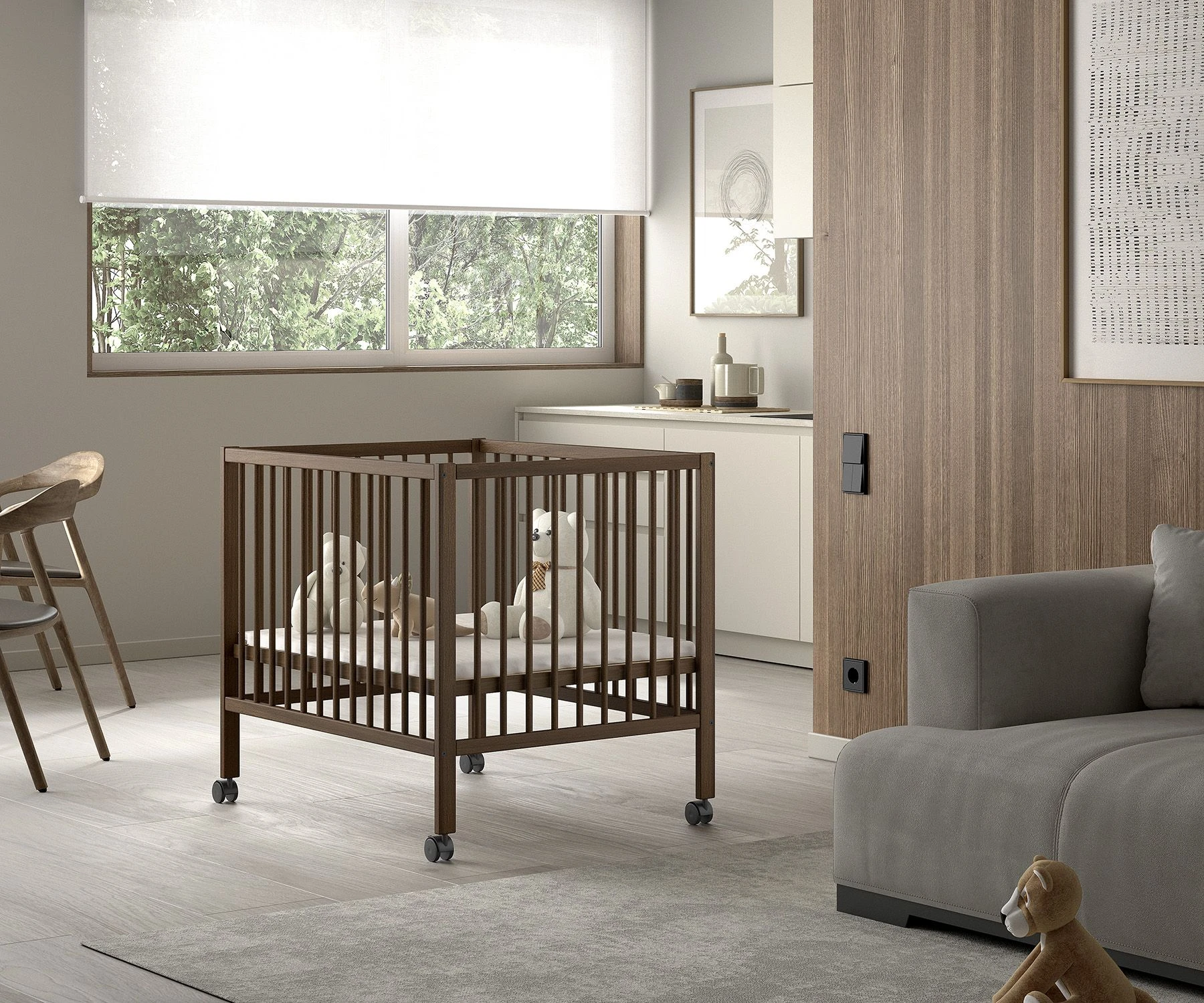 De babybox uit de Dino collectie van Jaxx, uitgevoerd in warm walnoot, combineert praktisch gemak met modern design. Deze box is ontworpen om perfect aan te sluiten op de behoeften van jonge ouders. De verstelbare bodem biedt drie verschillende hoogtestanden, waardoor de box moeiteloos meegroeit met je kind – van de eerste weken tot de actieve kruipfase.