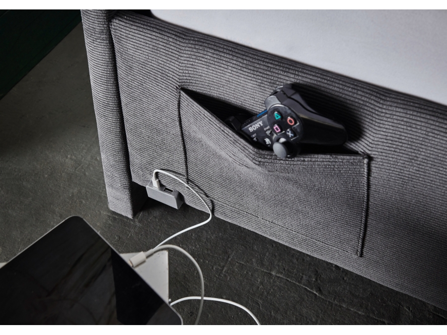 Het eigentijdse grijze ribstof design voegt een vleugje stijl toe aan je ruimte, terwijl de praktische zakken en de ingebouwde USB-verbinding het bed omtoveren tot een multifunctionele slaapoplossing.