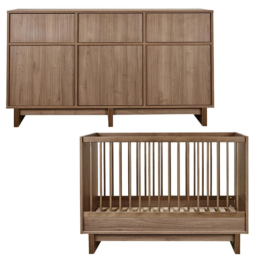 De prachtige Quax Kyo 2-delige babykamer in de kleur Walnut bestaat uit een ledikantje van 70×120 en een XL commode. Beide gemaakt uit een mix van massief beuken en melamine.