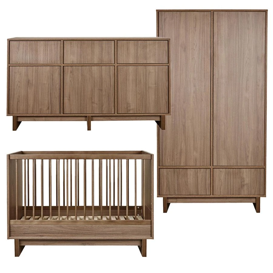 De prachtige Quax Kyo 3-delige babykamer in de kleur Walnut bestaat uit een ledikantje van 70×120, een XL commode en een 2-deurs kledingkast. Allen gemaakt uit een mix van massief beuken en melamine.