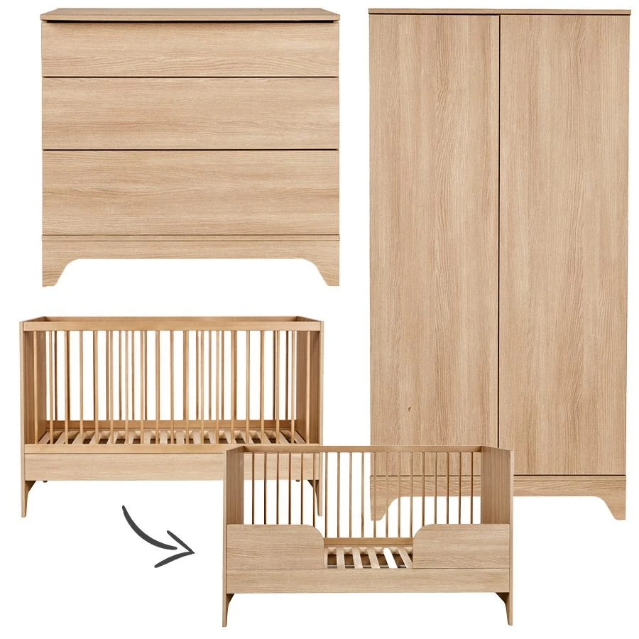 De prachtige Quax Tsugi 3-delige meegroeikamer in de kleur Honey Ash bestaat uit een bed van 70×140, een commode en een 2-deurs kledingkast. Allen gemaakt uit een mix van massief beuken en melamine.