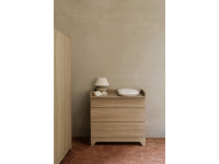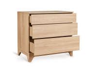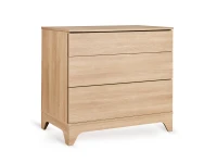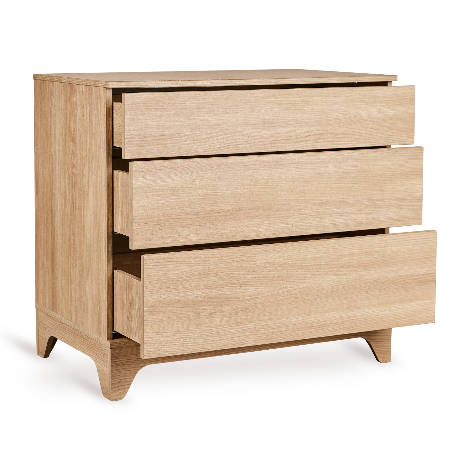 De commode beschikt over drie greeploze laden met een push-to-open systeem. Dit zorgt voor een strakke, moderne uitstraling en biedt tegelijk ruime opbergmogelijkheden voor kleding, verzorgingsspullen en accessoires. Zo heb je altijd alles overzichtelijk en binnen handbereik.