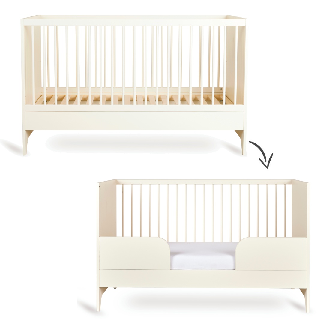 Een bijzonder praktisch detail is dat één spijlenzijde verwijderd kan worden. Hierdoor verandert het bedje moeiteloos in een peuterbed, zodat je er nog langer plezier van hebt en je kind stap voor stap veilig kan wennen aan zelfstandig slapen.