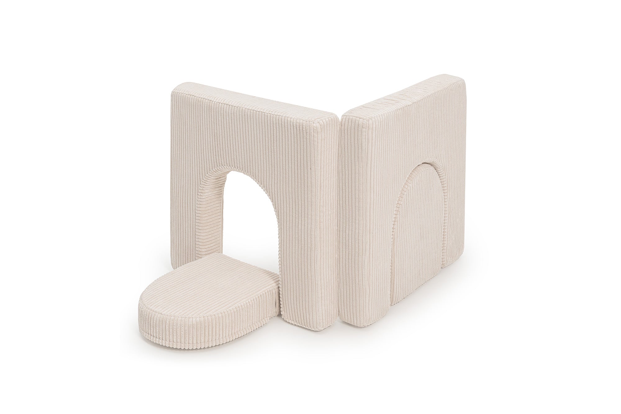 Deze Shappy Mini bogen set in de kleur Vanilla, gemaakt van zachte Ribstof, bevat twee stevige bogen met ingebouwde openingen en aparte deuren. Ze zijn perfect voor elk ridderavontuur of fantasierijk spel.
