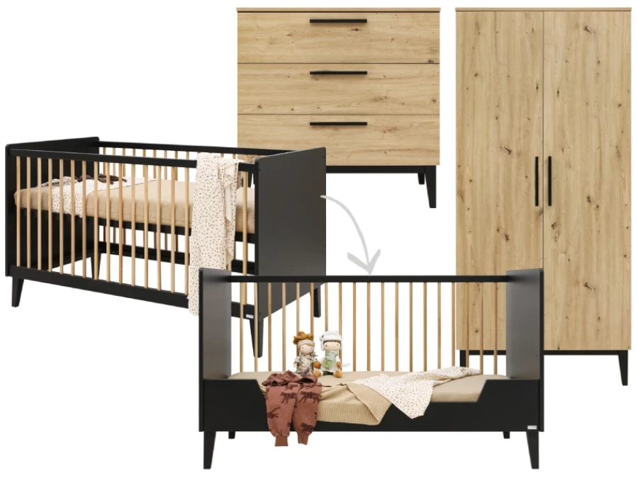 Deze ToiToiKids Xem 3-delige meegroeikamer bestaat uit een bedje, commode en tweedeurs kledingkast. Door deze set te kiezen heb je meer dan genoeg opbergruimte en een prachtig samenhangend geheel. De warme combinatie van mat zwart en eikenlook zorgt voor een prachtige uitstraling.