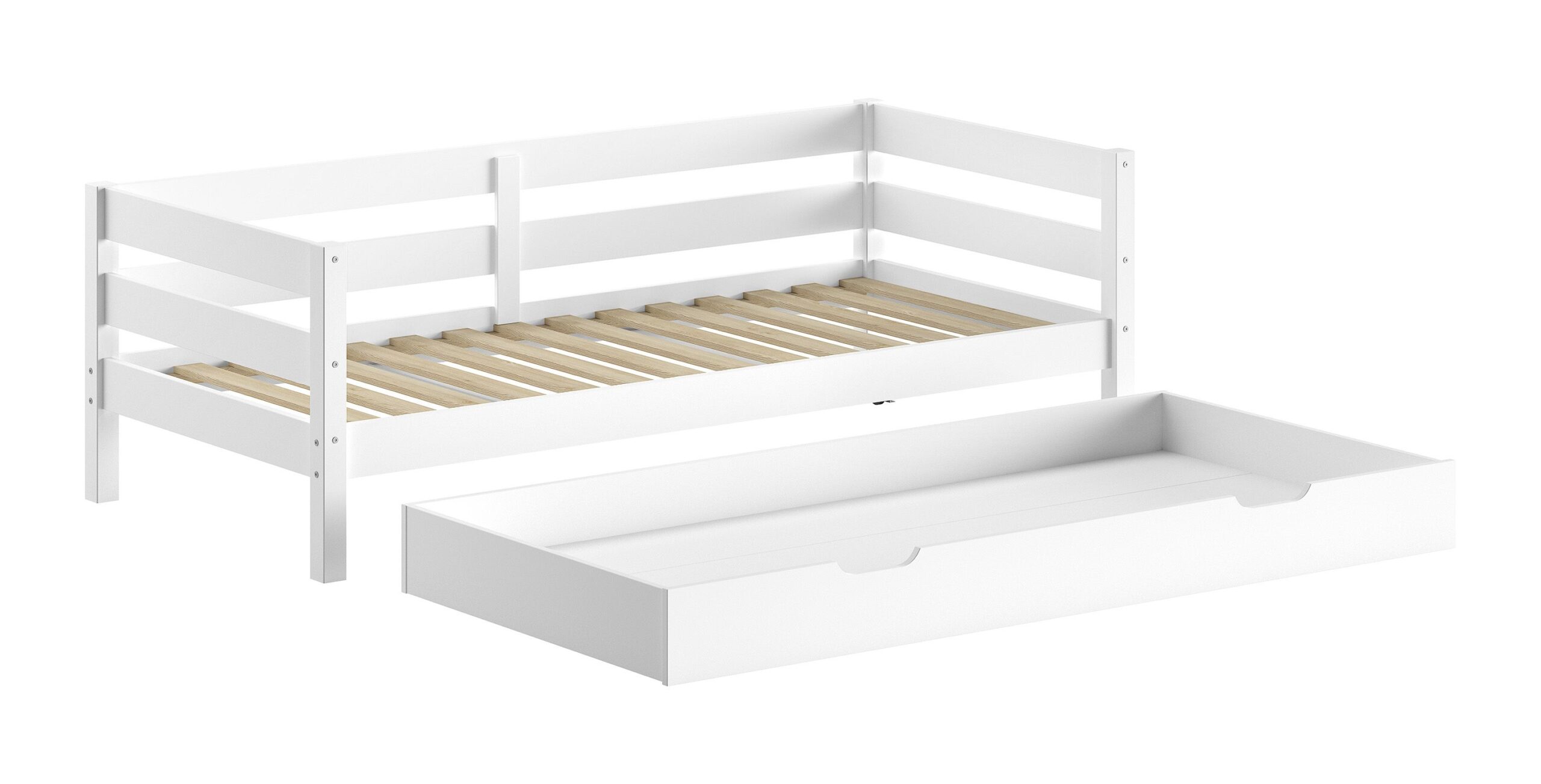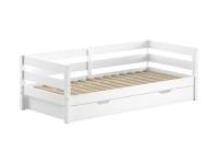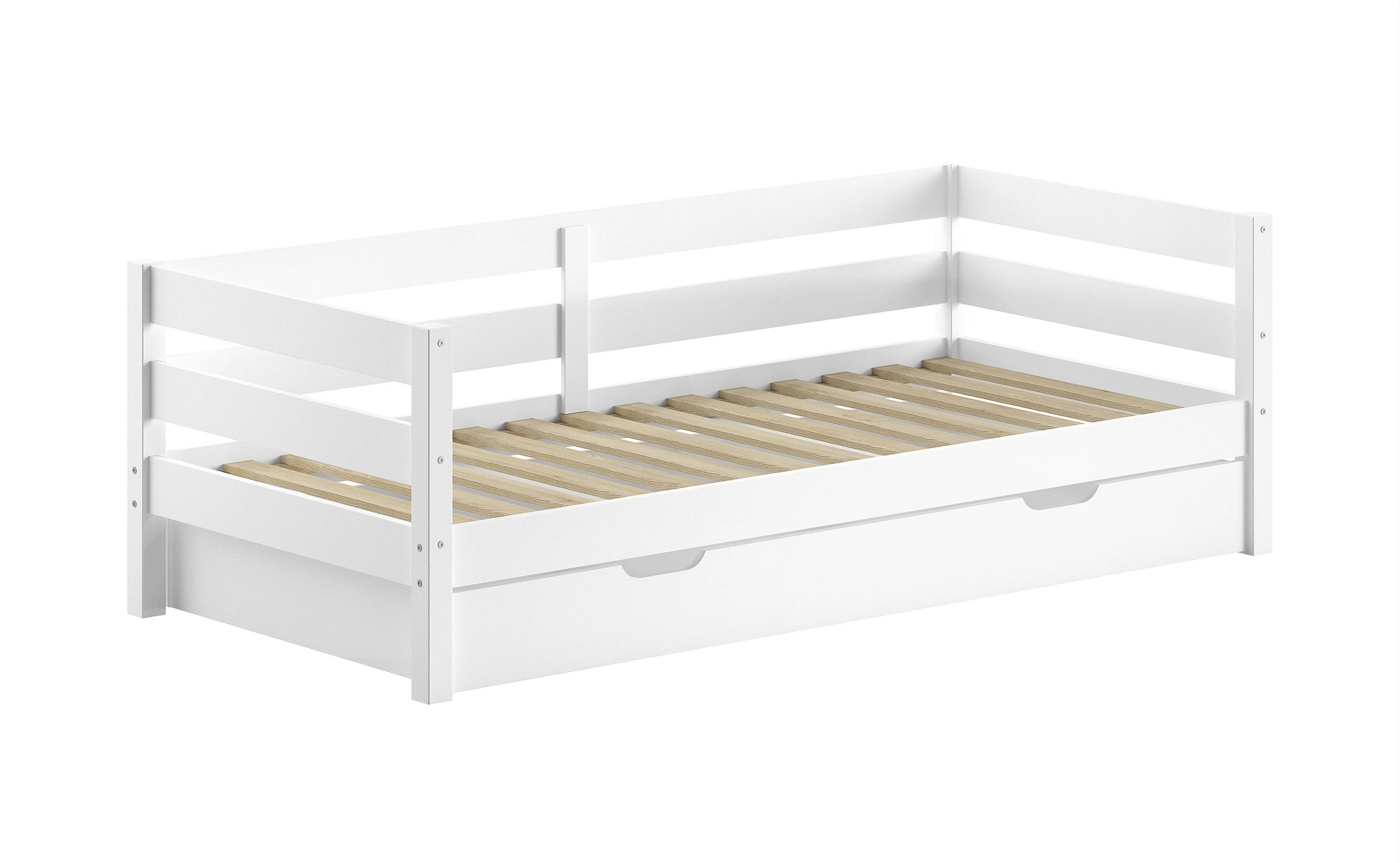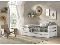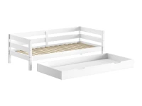 Het MARGRIT kajuitbed (90 x 200 cm) in wit is vervaardigd in massieve grenen. Het minimalistische en stijlvolle design maakt dat het in elk interieur past. Dit bed beschikt over een hekje langs 3 kanten met horizontale spijlen dat kan dienen als uitvalbeveiliging, maar dat ook ideaal is als zitbank in combinatie met kussens. De bijhorende bedlade kan ingezet worden als extra slaapplaats voor logees of als opbergruimte. Er zijn wieltjes voorzien zodat de lade gemakkelijk kan worden in- en uitgetrokken.