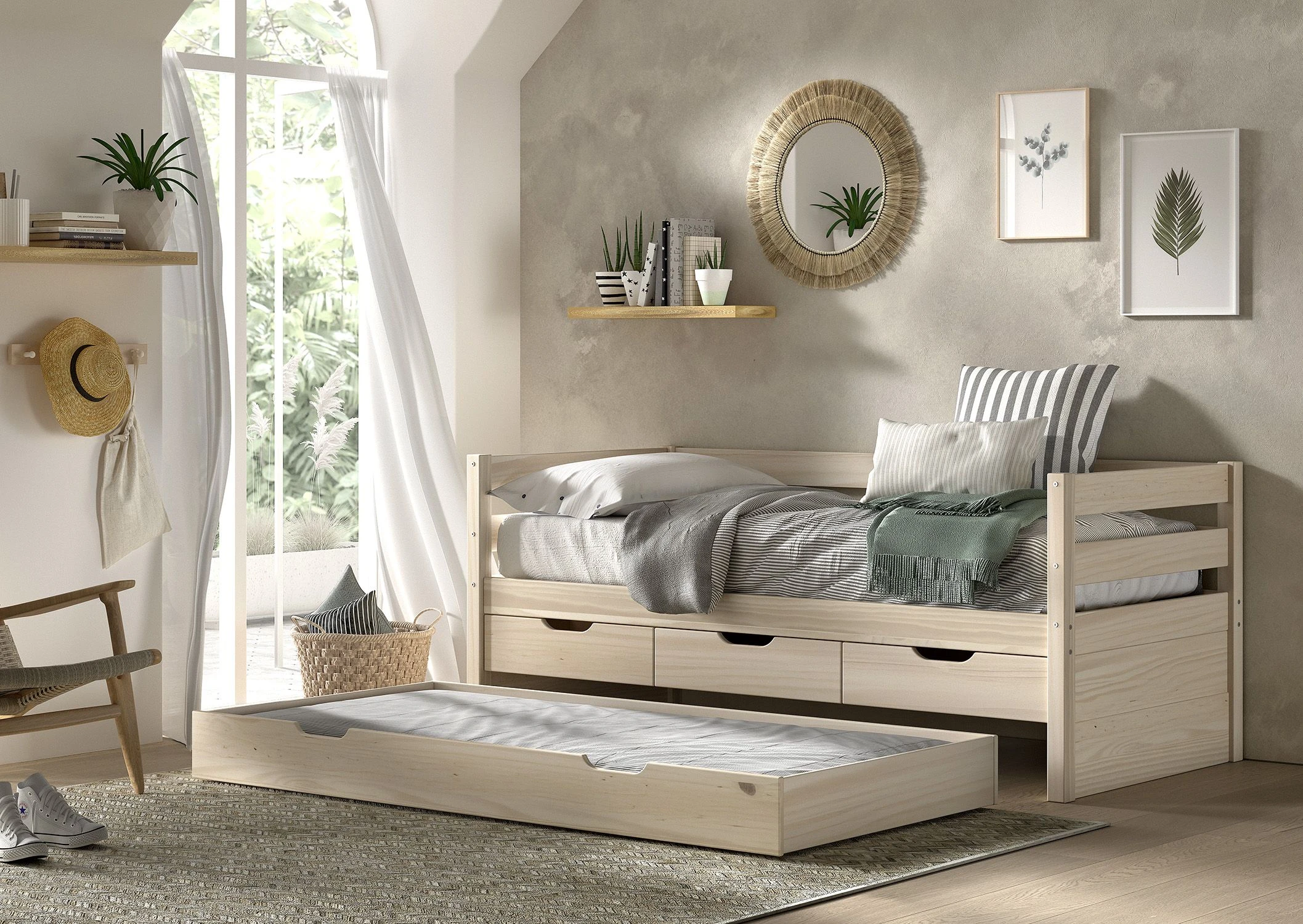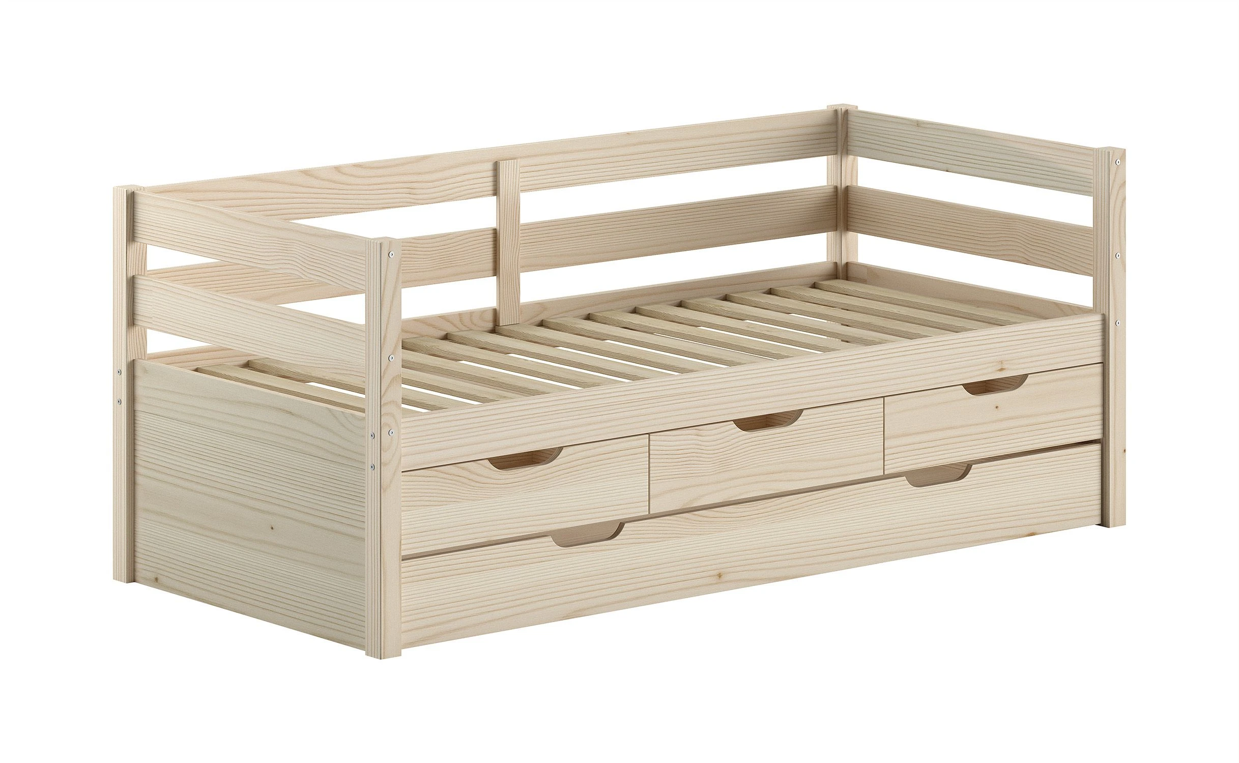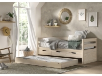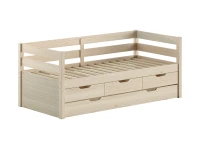 Het MARGRIT kajuitbed (90 x 200 cm) in milky pine is vervaardigd in massieve grenen. Dit bed beschikt over 3 handige opberglades. Het minimalistische en stijlvolle design maakt dat het in elk interieur past. Dit bed beschikt over een hekje langs 3 kanten met horizontale spijlen dat kan dienen als uitvalbeveiliging, maar dat ook ideaal is als zitbank in combinatie met kussens. De bijhorende bedlade kan ingezet worden als extra slaapplaats voor logees of als opbergruimte. Er zijn wieltjes voorzien zodat de lade gemakkelijk kan worden in- en uitgetrokken.