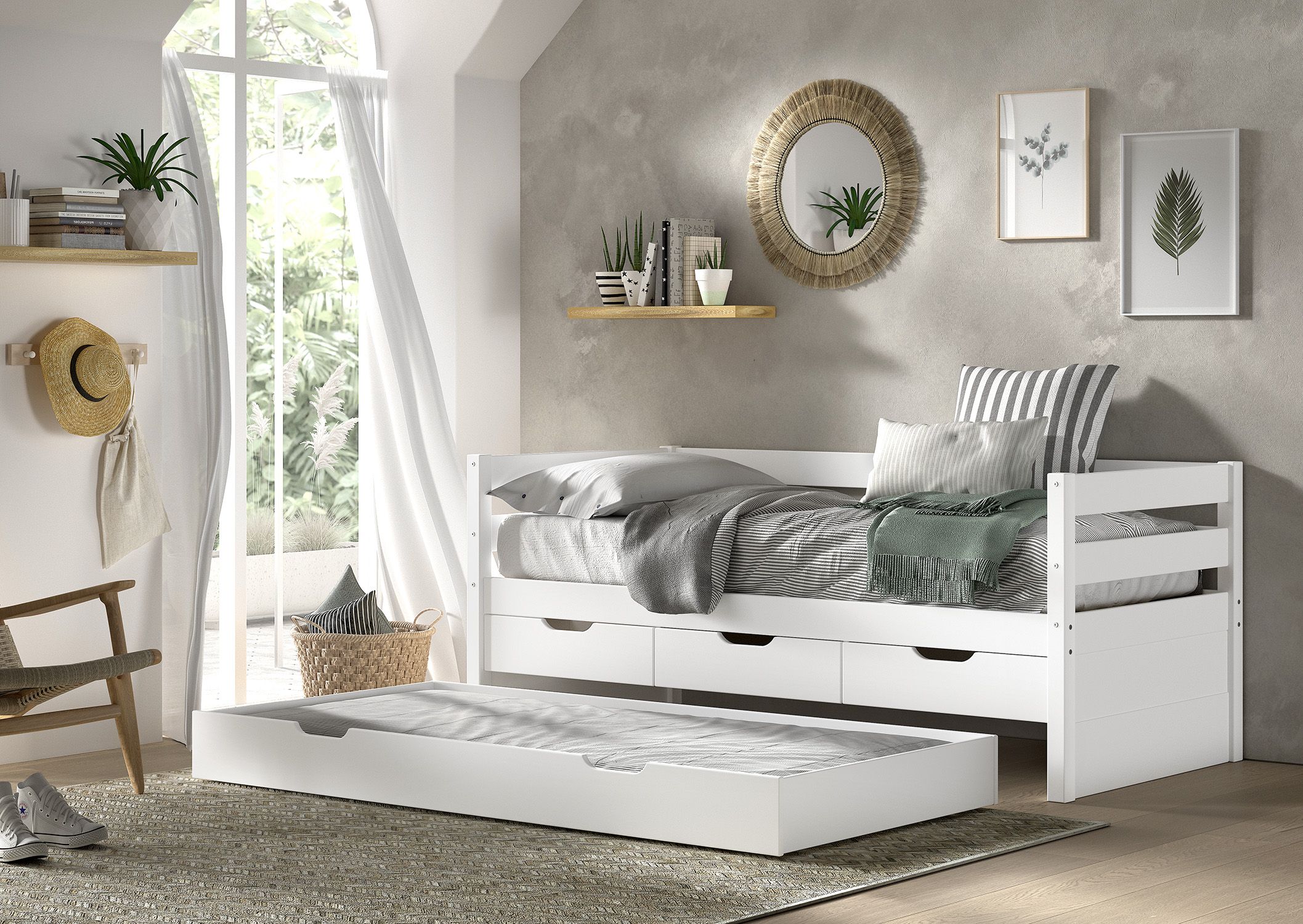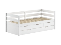 Het MARGRIT kajuitbed (90 x 200 cm) in wit is vervaardigd in massieve grenen. Dit bed beschikt over 3 handige opberglades. Het minimalistische en stijlvolle design maakt dat het in elk interieur past. Dit bed beschikt over een hekje langs 3 kanten met horizontale spijlen dat kan dienen als uitvalbeveiliging, maar dat ook ideaal is als zitbank in combinatie met kussens. De bijhorende bedlade kan ingezet worden als extra slaapplaats voor logees of als opbergruimte. Er zijn wieltjes voorzien zodat de lade gemakkelijk kan worden in- en uitgetrokken.