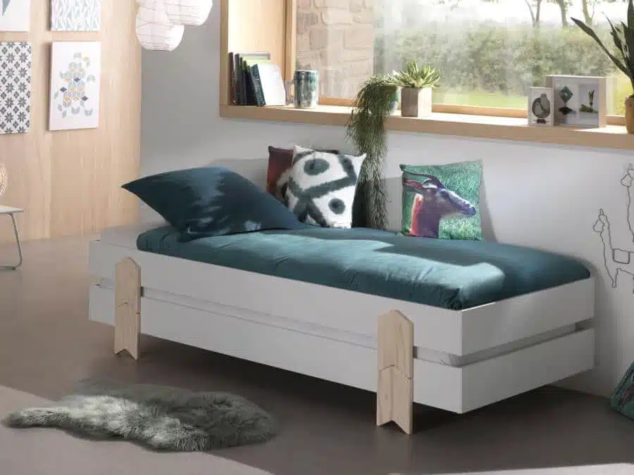 Deze set bestaat uit 2x het handige Vipack Modulo Arrow eenpersoonsbed. Dit bed is stapelbaar. Wanneer je er dus meerdere hebt kun je in no-time een logeerbed tevoorschijn toveren. Het bed is afgewerkt met milieu vriendelijke witte lak en heeft massief grenen pootjes in de vorm van een pijl. Dit bed is ook beschikbaar met andere poten; een smiley of puzzelstuk. De lattenbodem is inbegrepen. De matrasmaat is 90×200 en een geschikt matras kun je los bij bestellen. Voor dit bed adviseren we de Vipack Soft of Soft Deluxe.