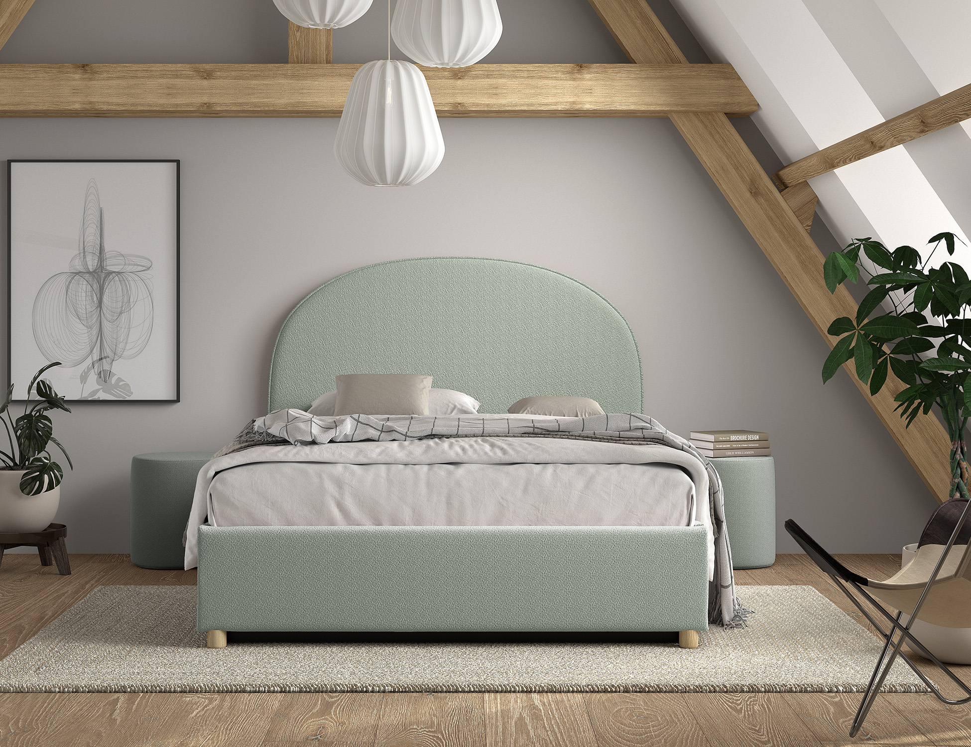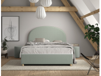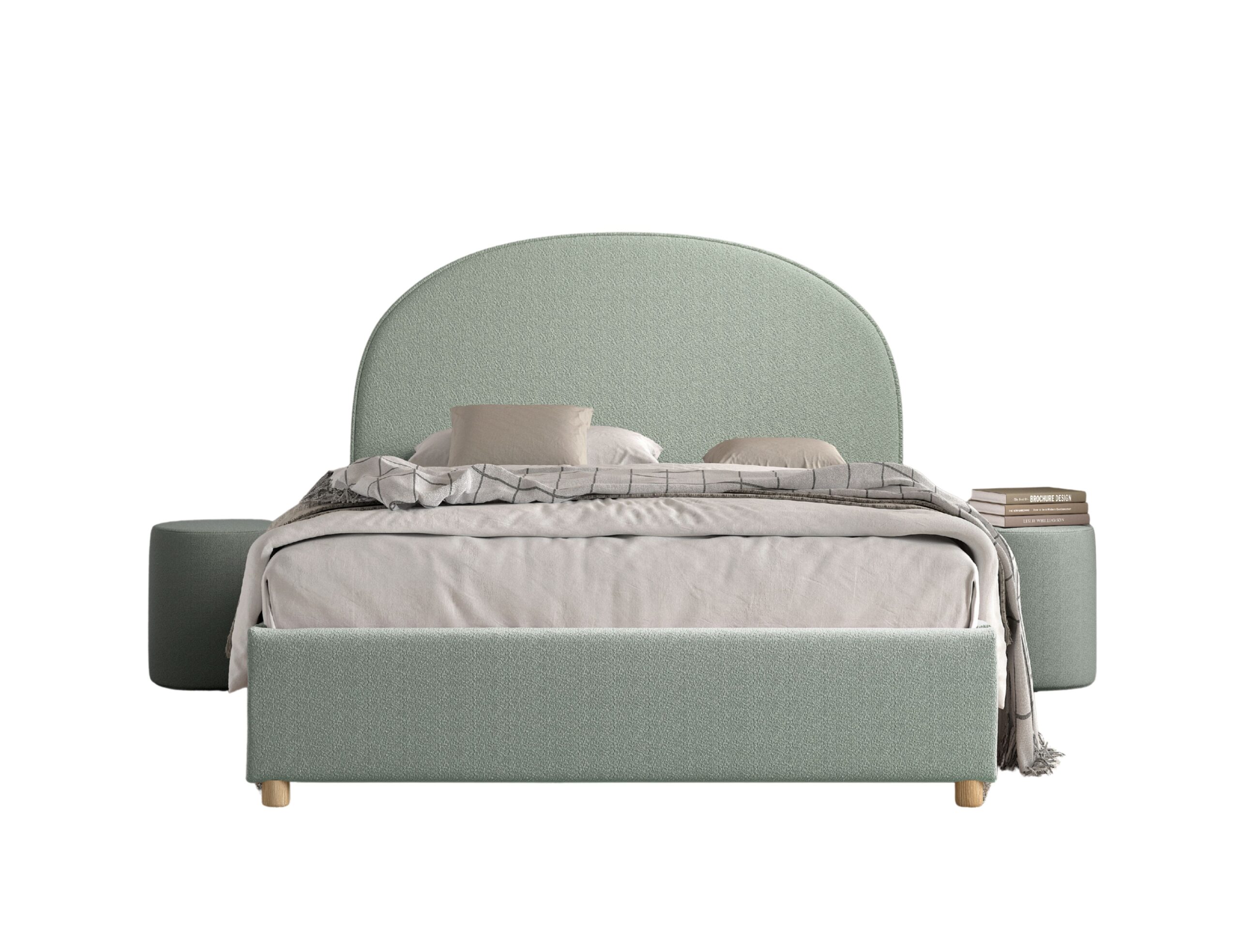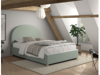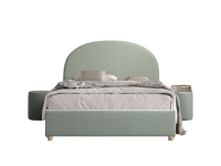 Het MOON bed met een matrasmaat van 140 x 200 cm is bekleed met luxe groene bouclé. Het afgeronde hoofdbord geeft het bed een warme en gezellige uitstraling. Dankzij de zachte stof voelt het bovendien comfortabel en sfeervol aan. Onder het bed bevindt zich praktische opbergruimte, bereikbaar door de lattenbodem en het matras eenvoudig omhoog te tillen met een lint. Bij de set horen ook twee bijpassende poefjes in dezelfde bouclé stof. Deze poef is een echte eye-catcher en voegt warmte en stijl toe aan elke ruimte. Je kunt hem gebruiken als extra zitplaats, voetenbankje of zelfs als trendy nachttafeltje naast het bed. Zo vormt de combinatie van het bed en de poef een luxe en veelzijdige toevoeging aan de slaapkamer.