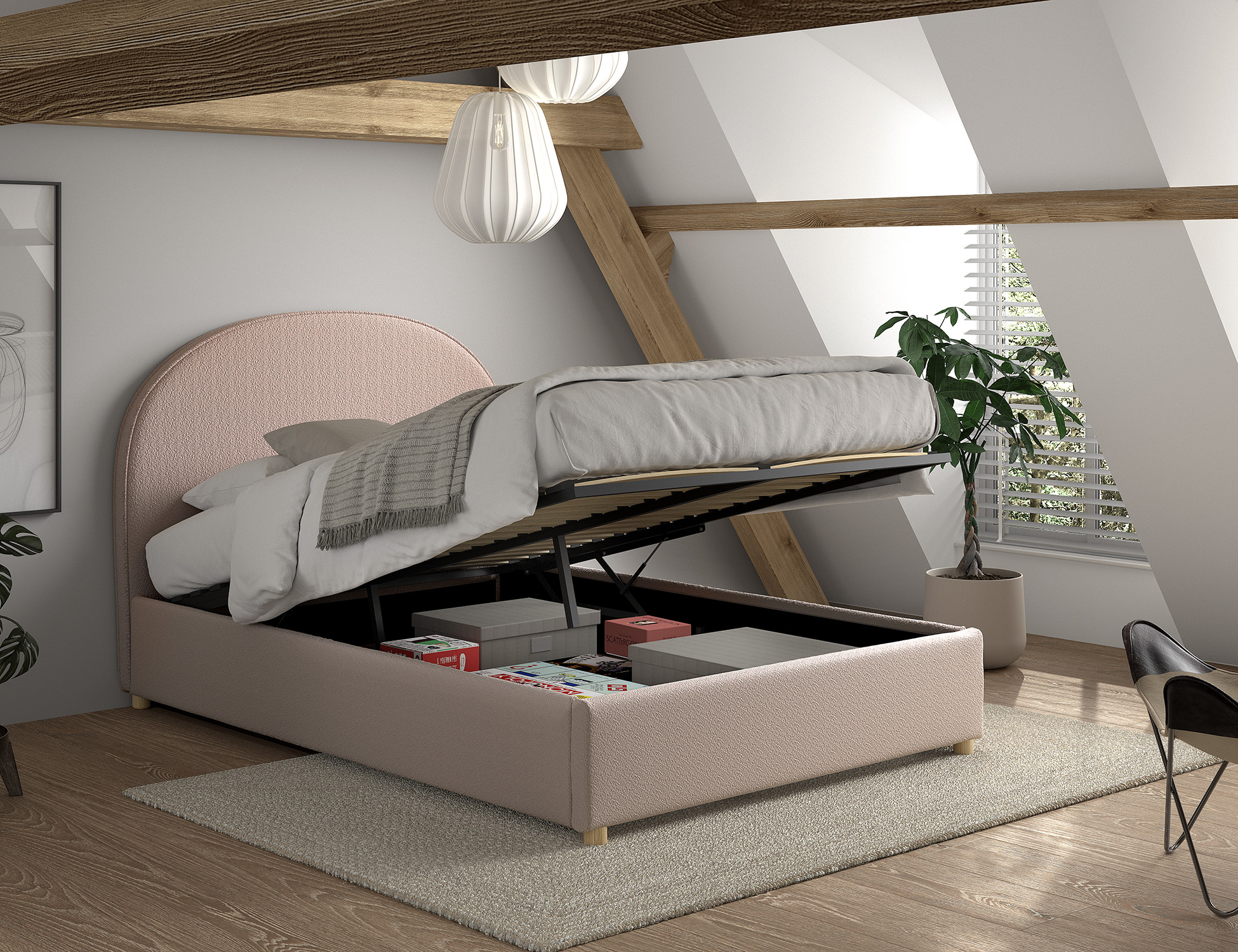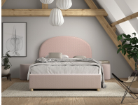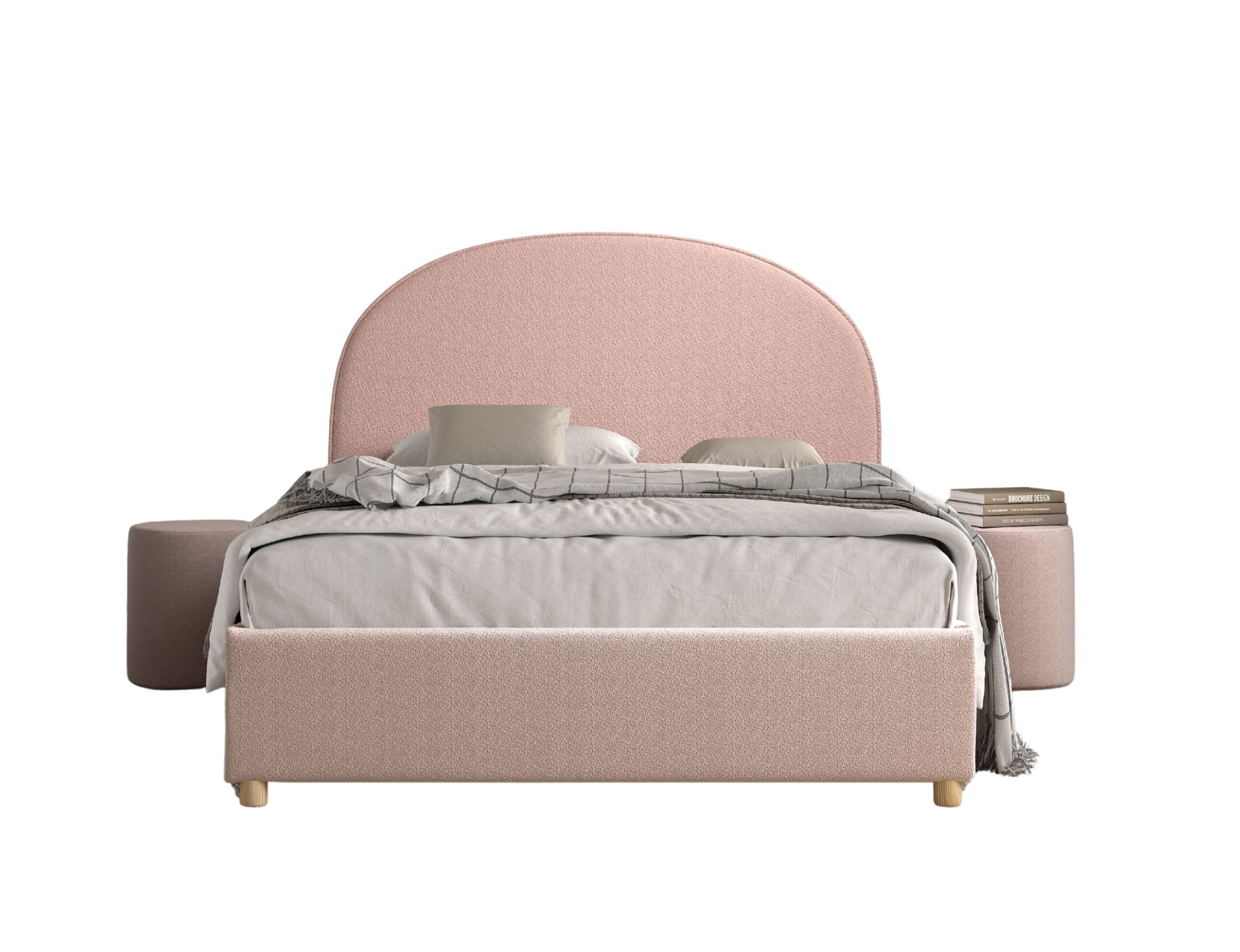 Het MOON bed met een matrasmaat van 140 x 200 cm is bekleed met luxe roze bouclé. Het afgeronde hoofdbord geeft het bed een warme en gezellige uitstraling. Dankzij de zachte stof voelt het bovendien comfortabel en sfeervol aan. Onder het bed bevindt zich praktische opbergruimte, bereikbaar door de lattenbodem en het matras eenvoudig omhoog te tillen met een lint. Bij de set horen ook twee bijpassende poefjes in dezelfde bouclé stof. Deze poef is een echte eye-catcher en voegt warmte en stijl toe aan elke ruimte. Je kunt hem gebruiken als extra zitplaats, voetenbankje of zelfs als trendy nachttafeltje naast het bed. Zo vormt de combinatie van het bed en de poef een luxe en veelzijdige toevoeging aan de slaapkamer.