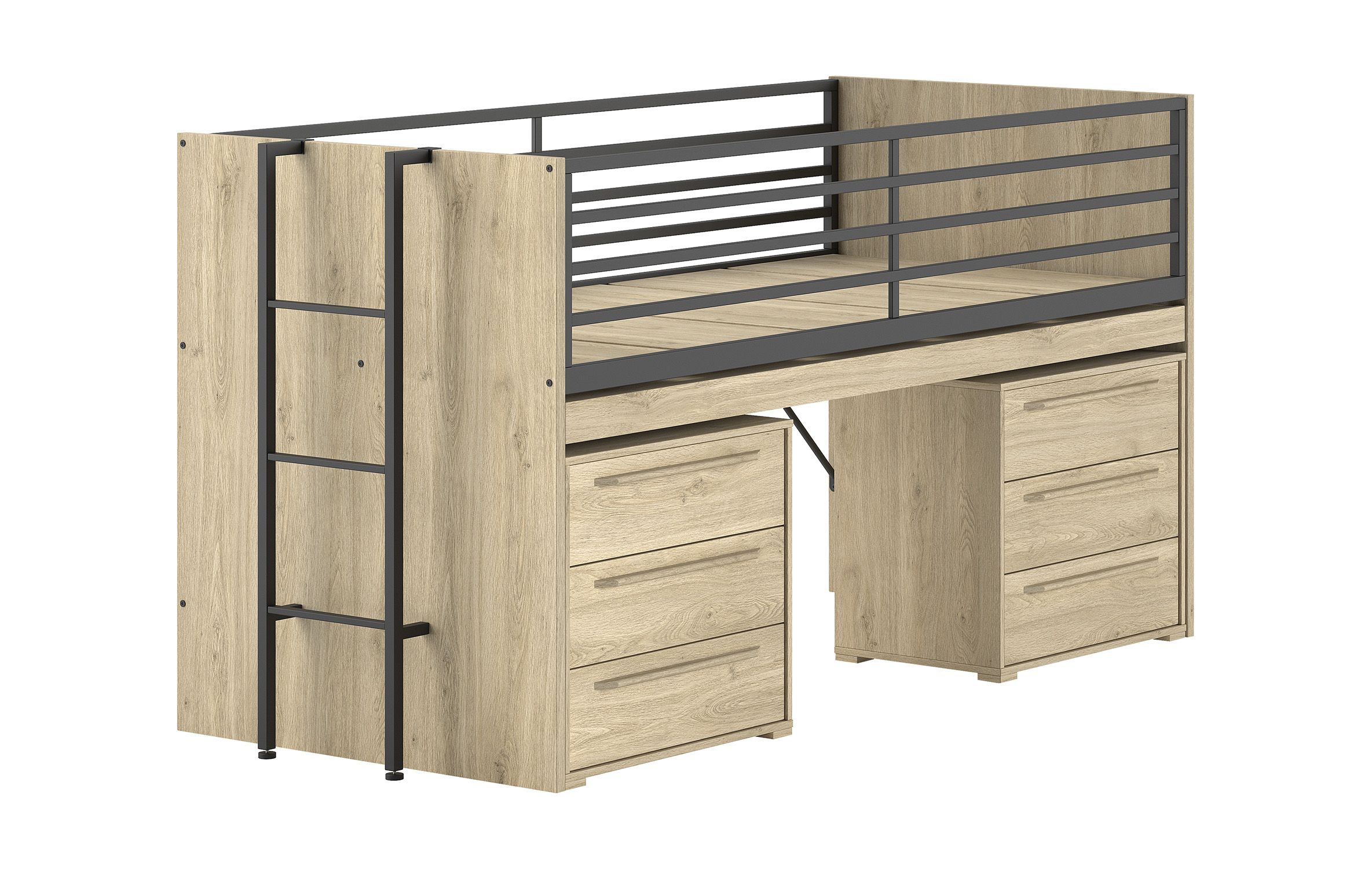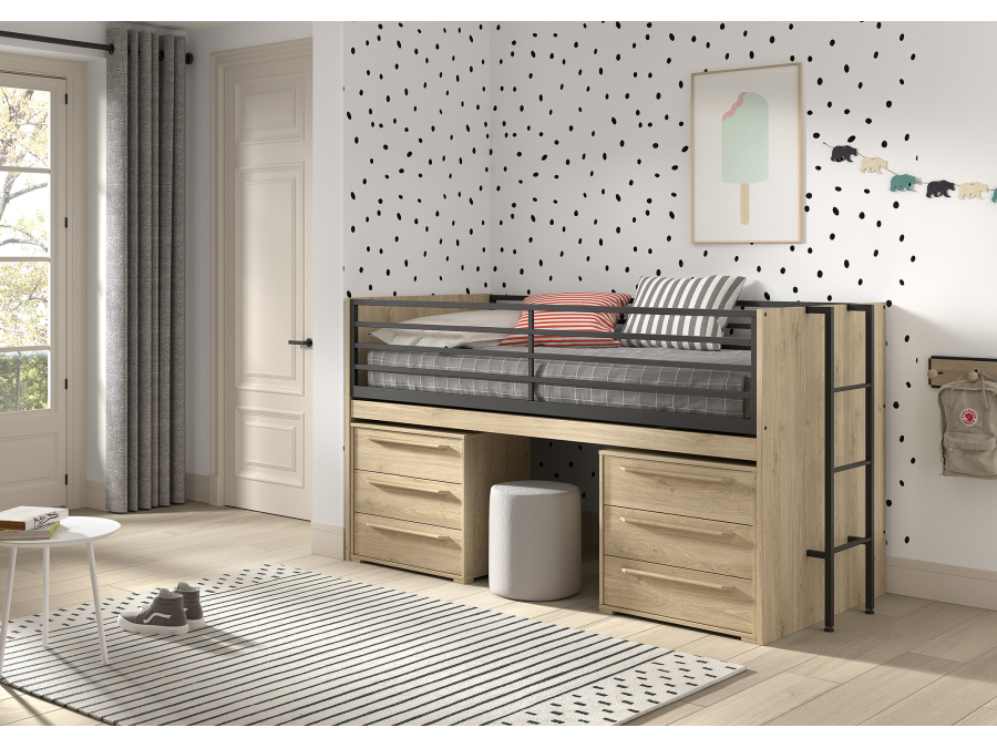Deze Vipack Sam halfhoogslaper in een trendy eikenlook uitvoering heeft in combinatie met de zwarte metalen accenten een eigentijdse uitstraling. Het bed is een slimme en stijlvolle optie voor wie op zoek is naar ruimtebesparende slaapmogelijkheden. Het bed is ontworpen met oog voor detail en functionaliteit. Het uitschuifbare bureau heeft een heel ruim oppervlak waardoor het perfect is voor het maken van huiswerk of andere creatieve bezigheden. Het bed beschikt over een uitvalbeveiliging en een stevige ladder die zowel links als rechts bevestigd kan worden. De ruimte onder het bureau wordt benut als extra bergruimte door de twee ladekasten. Beide ladekasten hebben drie ruime lades waardoor je zeer veel spullen uit het zicht kunt opbergen. De lades zijn voorzien van soft-close.